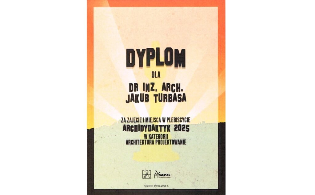Dom w Beskidzie Żywieckim – relacja z budowy 12-2025 Dom w Beskidzie Żywieckim – relacja z budowy 12-2025 Kaplica w Rychwałdzie wśród 60 najciekawszych realizacji ostatnich 5 lat w Polsce 11-2025 Kaplica wśród 60 najciekawszych realizacji ostatnich 5 lat w Polsce 11-2025 Polskie Radio Rzeszów – audycja „Rozmowy o sztuce powojennej w przestrzeni miejskiej, rzeszowskie realizacje” 28-09-2025 Polskie Radio Rzeszów – audycja „Rozmowy o sztuce powojennej w przestrzeni miejskiej, rzeszowskie realizacje” 28-09-2025 Zespół eremów – relacja z budowy 09-2025 Zespół eremów – relacja z budowy 09-2025 Prelekcja w ramach spotkania pt. „Zabytki coraz bliższe współczesności… rzeszowskie realizacje Zbigniewa Brodowskiego i Witolda Cęckiewicza” 06-09-2025 Prelekcja w ramach spotkania pt. „Zabytki coraz bliższe współczesności… rzeszowskie realizacje Zbigniewa Brodowskiego i Witolda Cęckiewicza” 06-09-2025 Wystawa “Szkice architektoniczne” 07-2025 Wystawa “Szkice architektoniczne” 07-2025 Archidytaktyk roku 2025 – Jakub Turbasa 06-2025 Archidytaktyk roku 2025 06-2025 MapsArch – projekt Kaplicy wśród najważniejszych wydarzeń miesiąca 05-2025 MapsArch – projekt Kaplicy wśród najważniejszych wydarzeń miesiąca 06-05-2025 „Nowa architektura sakralna” – wykład oraz prezentacja autorskich projektów sakralnych 06-05-2025 „Nowa architektura sakralna” – wykład oraz prezentacja autorskich projektów sakralnych 06-05-2025 Lista artykułów J. Turbasy opublikowanych w roku 2024 2025 Lista artykułów J. Turbasy opublikowanych w roku 2024 2025 „Wymiary współczesnej architektury sakralnej” – wykład 14-12-2024 „Wymiary współczesnej architektury sakralnej” – wykład 14-12-2024 „The Architecture of Prayer” vol 2, vol 3 – wystawa w Walford Art Gallery & Brauer Museum of Art (USA) 04-2024 > 09.2024 „The Architecture of Prayer” vol 2, vol 3 – wystawa w Walford Art Gallery & Brauer Museum of Art (USA) 04-2024 > 09.2024 C3 KOREA / C3 DIZ – Kaplica Ostatniego Pożegnania w Rychwałdzie 12-2023 C3 KOREA / C3 DIZ – Kaplica Ostatniego Pożegnania w Rychwałdzie 12-2023 Międzynarodowe Biennale Architektury Kraków 2023Wystawa „WA PK 13/2” 10-2023 Międzynarodowe Biennale Architektury Kraków 2023Wystawa „WA PK 13/2” 10-2023 Ukończenie prac nad projektem – biuro 07-2023 Ukończenie prac nad projektem – biuro 07-2023 VOGUE Taiwan – Kaplica Ostatniego Pożegnania w Rychwałdzie 06-2023 VOGUE Taiwan – Kaplica Ostatniego Pożegnania w Rychwałdzie 06-2023 Premiera książki „Teorie i manifesty polskich architektów” 06-2023 Premiera książki „Teorie i manifesty polskich architektów” 06-2023 Architektura & Biznes – publikacja projektu Kamienicy Pod Złotymi Nożycami w Krakowie w miesięczniku „A&B” 05-2023 Architektura & Biznes – publikacja projektu Kamienicy Pod Złotymi Nożycami w Krakowie w miesięczniku „A&B” 05-2023 Architektura & Biznes – artykuł o projekcie Kamienicy Pod Złotymi Nożycami w Krakowie + rozmowa z Jakubem Turbasą 04-2023 Architektura & Biznes – artykuł o projekcie Kamienicy Pod Złotymi Nożycami w Krakowie + rozmowa z Jakubem Turbasą 04-2023 „The Architecture of Prayer” – wystawa projektów sakralnych w Center Art Gallery na Calvin University (USA) 02/04-2023 „The Architecture of Prayer” – wystawa projektów sakralnych w Center Art Gallery na Calvin University (USA) 02/04-2023 „INHERITAGE Taiwan : Sotheby’s” – publikacja projektu Kaplicy Ostatniego Pożegnania 02-2023 „INHERITAGE Taiwan : Sotheby’s” – publikacja projektu Kaplicy Ostatniego Pożegnania 02-2023 Wystawa nagrodzony projektów przy Cricotece + Wręczenie Nagrody im. Stanisława Witkiewicza 02-2023 Wystawa nagrodzony projektów przy Cricotece + Wręczenie Nagrody im. Stanisława Witkiewicza 02-2023 Projekt Kaplicy Ostatniego Pożegnania wśród najlepszych realizacji sakralnych UE + Nagranie prezentacji projektu 01-2023 Projekt Kaplicy Ostatniego Pożegnania wśród najlepszych realizacji sakralnych UE + Nagranie prezentacji projektu 01-2023 II Nagroda Województwa Małopolskiego im. Stanisława Witkiewicza – Kamienica pod Złotymi Nożycami 12-2022 II Nagroda Województwa Małopolskiego im. Stanisława Witkiewicza – Kamienica pod Złotymi Nożycami 12-2022 Obrona rozprawy doktorskiej pt. „Architektura stosowna. Współczesne tendencje projektowe w architekturze krajów rozwijających się” 07-2022 Obrona rozprawy doktorskiej pt. „Architektura stosowna. Współczesne tendencje projektowe w architekturze krajów rozwijających się” 07-2022 Ukończenie prac na projektem wnętrz 07-2022 Ukończenie prac nad projektem wnętrz 07-2022 „Architektura-murator” – publikacja projektu Kaplicy Ostatniego Pożegnania 04-2022 „Architektura-murator” – publikacja projektu Kaplicy Ostatniego Pożegnania 04-2022 Dominikański Ośrodek Liturgiczny – Dzień Otwarty. Panel dyskusyjny – Nagranie VIDEO 02-2022 Dominikański Ośrodek Liturgiczny – Dzień Otwarty. Panel dyskusyjny – Nagranie VIDEO 02-2022 Sztuka Architektury. Nominacja w Plebiscycie Polska Architektura 2021 03-2022 Sztuka Architektury. Nominacja w Plebiscycie Polska Architektura 2021 03-2022 ArchDaily. Nominacja projektu Kaplicy Ostatniego Pożegnania do Nagrody Budynku Roku 2022 01/02-2022 ArchDaily. Nominacja projektu Kaplicy Ostatniego Pożegnania do Nagrody Budynku Roku 2022 01/02-2022 Sztuka Architektury. Prezentacja obiektu – Kaplica Ostatniego Pożegnania w Rychwałdzie 19-01-2022 Sztuka Architektury. Prezentacja obiektu – Kaplica Ostatniego Pożegnania w Rychwałdzie 19-01-2022 Nominacja w konkursie NAGRODA ROKU SARP 2021 za najlepszy obiekt architektoniczny w Polsce. Kaplica Ostatniego Pożegnania w Rychwałdzie 2021 Nominacja w konkursie NAGRODA ROKU SARP 2021 za najlepszy obiekt architektoniczny w Polsce. Kaplica Ostatniego Pożegnania w Rychwałdzie 2021 I NAGRODA